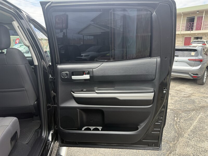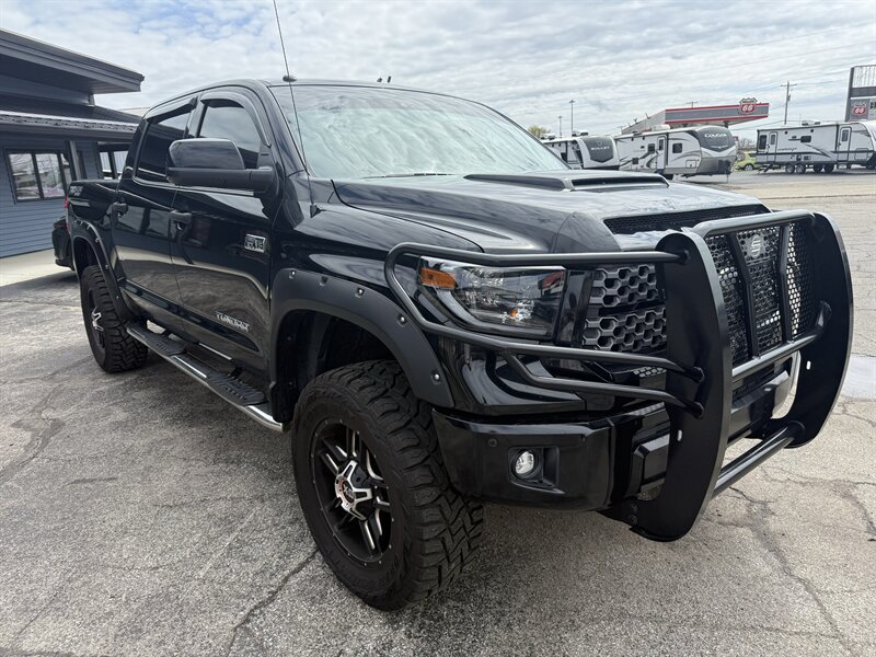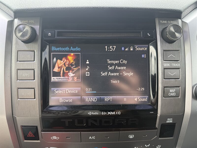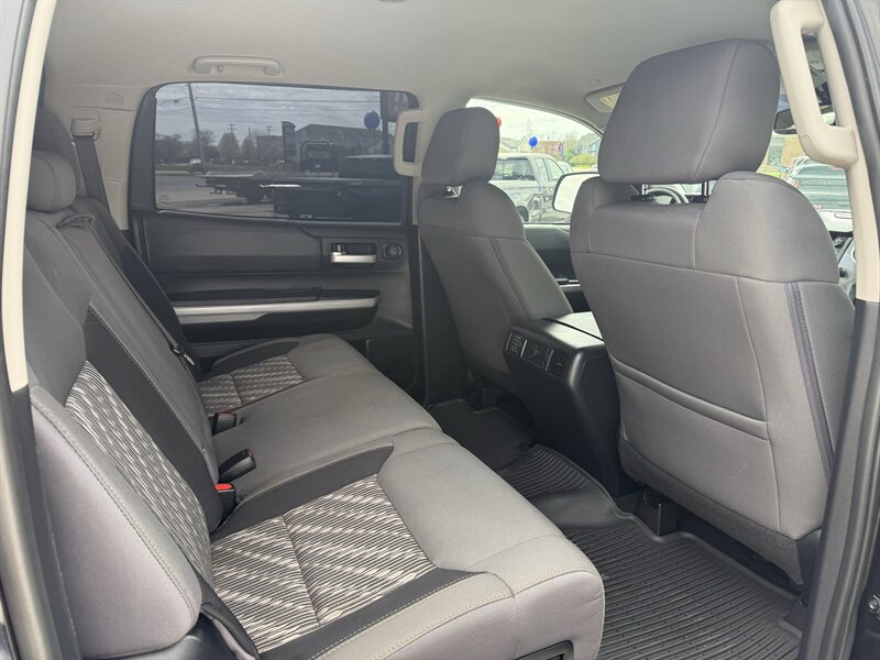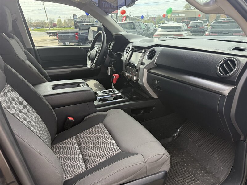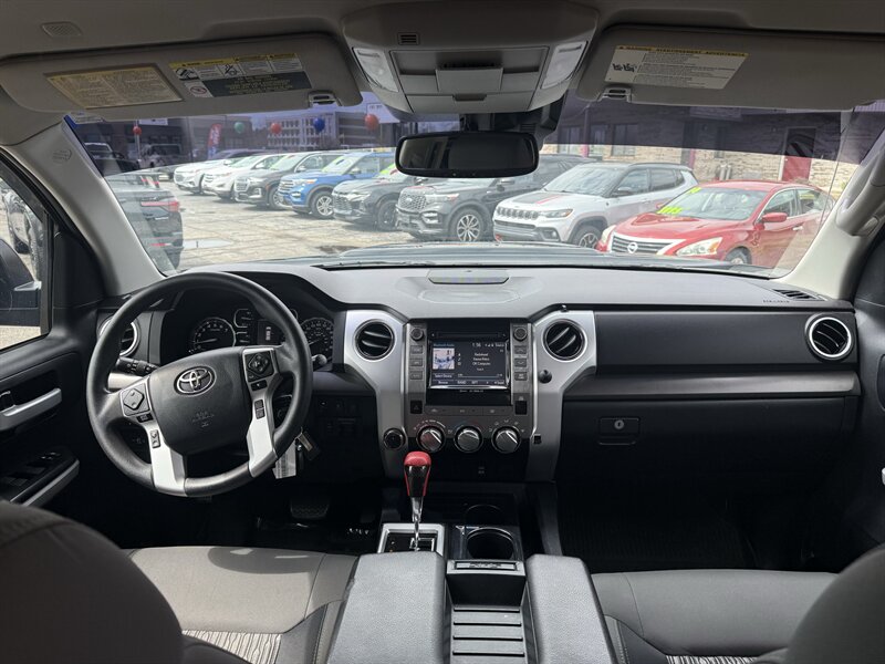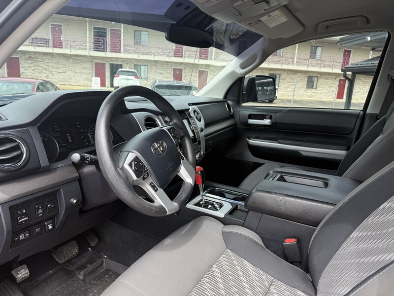 2019 Toyota Tundra SR5 in Midnight Black Metallic with Graphite cloth interior — powered by a thirsty (in a good way) 5.7L Flex-Fuel V8 delivering 381 hp and 401 lb-ft of torque. Factory-equipped with Toyota Entune infotainment (Bluetooth and USB), rearview camera, power windows/locks, remote keyless entry, cruise control, tilt/telescoping steering wheel, steering-wheel audio controls, durable cloth seats, ABS, stability and traction control, multiple airbags, tire-pressure monitoring and towing-friendly features like tow/haul mode and trailer-sway control. Excellent overall condition with a clean CARFAX — tough enough to haul your toys, classy enough to park next to a Prius and not be ashamed.