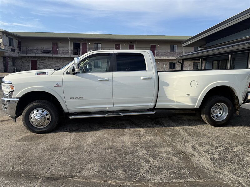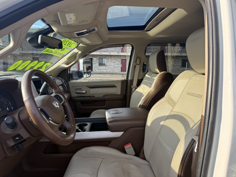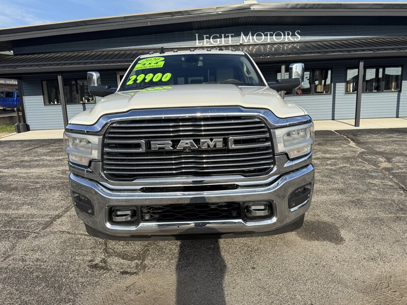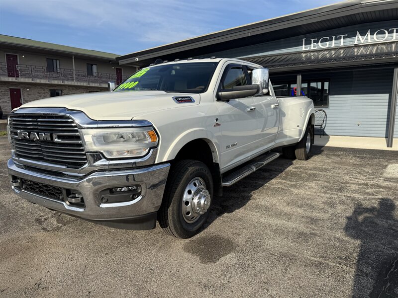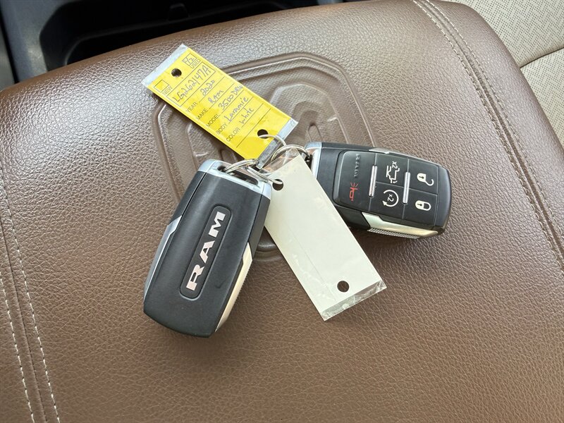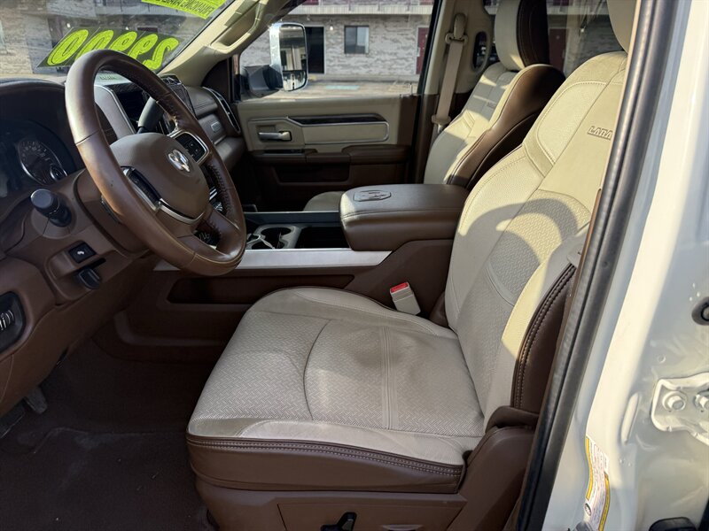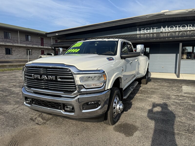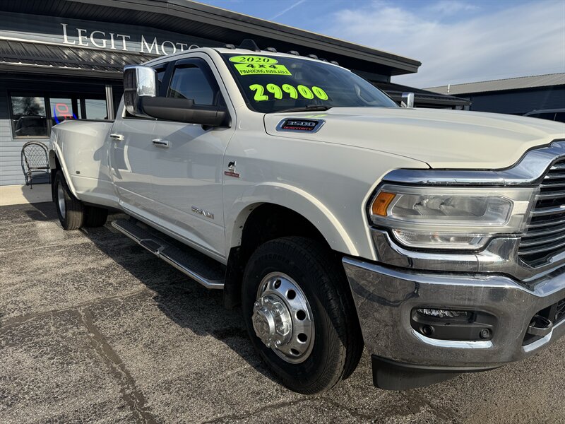 2020 RAM 3500 Laramie — Bright White Clear Coat outside, Mountain Brown/Light Frost Beige leather inside, and a Cummins 6.7L turbo diesel I6 putting out a gut-punching 370 hp and 850 lb-ft of torque (yes, seriously). Factory-equipped for serious work and civilized comfort: leather-trimmed power front seats with heating and ventilation, dual-zone automatic climate control, power-adjustable driver memory, a Uconnect touchscreen with Apple CarPlay/Android Auto and Bluetooth, steering-wheel controls, premium audio, power mirrors (heated, with turn indicators), chrome exterior accents and polished wheels, LED lighting, rearview camera and parking sensors, robust towing hardware and stability/traction control plus full airbag/ABS protection. In excellent overall condition with a clean CARFAX — basically a gentle giant that can tow your toys and still look good dropping the kids off at school.