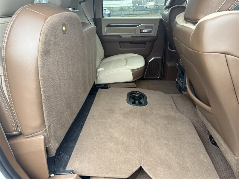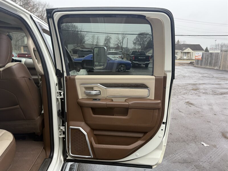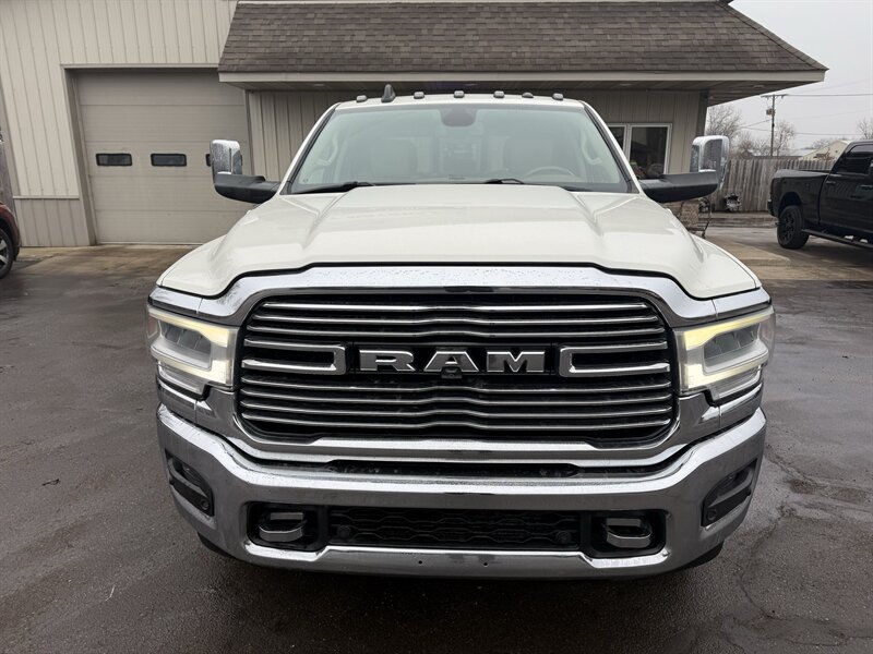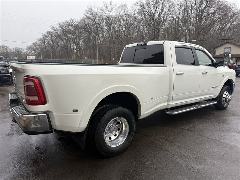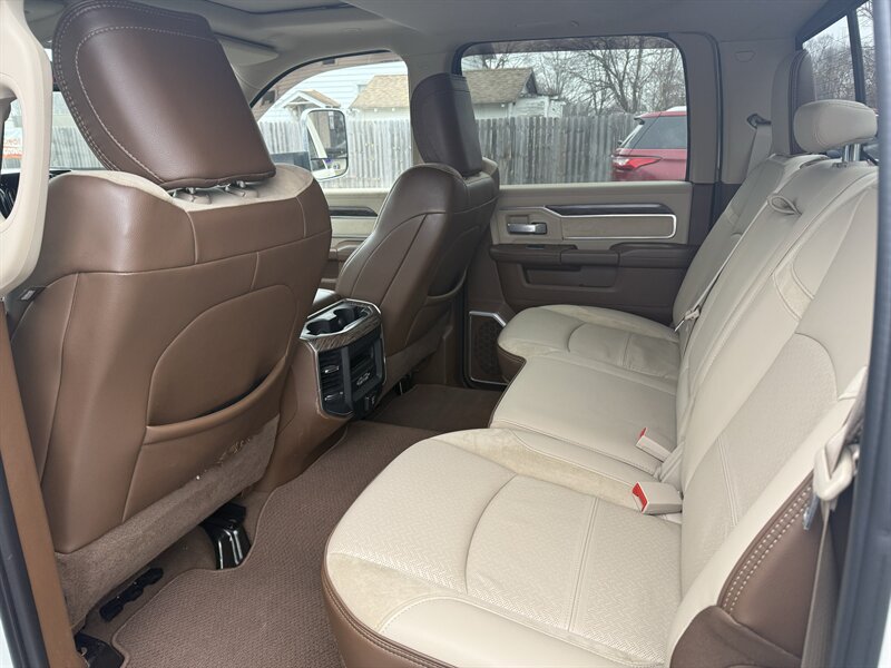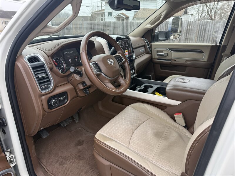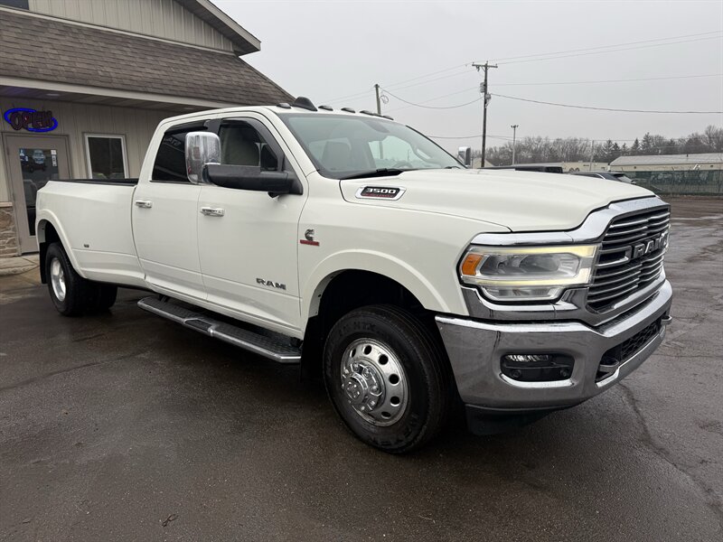 2020 RAM 3500 Laramie — Pearl White with a Mountain Brown/Light Frost Beige leather interior, powered by a Cummins 6.7L Diesel Turbo I6 delivering 370 hp and 850 lb-ft of torque. Loaded with Laramie comforts and work-ready features: premium leather seats with heat, ventilation, and power adjustments (plus memory for driver and passenger), dual-zone climate control, heated steering wheel, rearview camera with parking sensors, and Uconnect infotainment with Apple CarPlay, Android Auto, Bluetooth, SiriusXM, and navigation. Comes with remote keyless entry, chrome trim, power-folding tow mirrors, heavy-duty suspension, and a factory tow/prep package for serious hauling. In excellent shape with a clean CARFAX — as dependable as your morning coffee, only much better at towing.