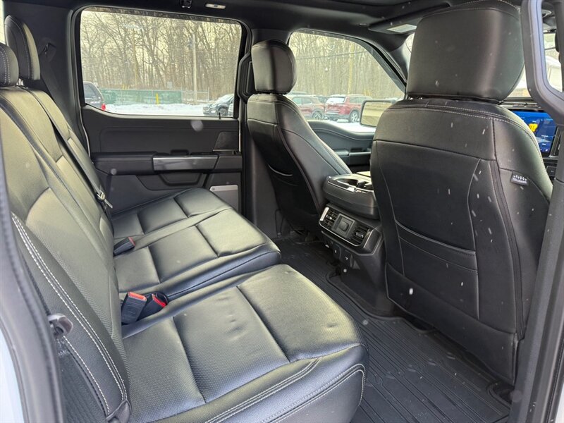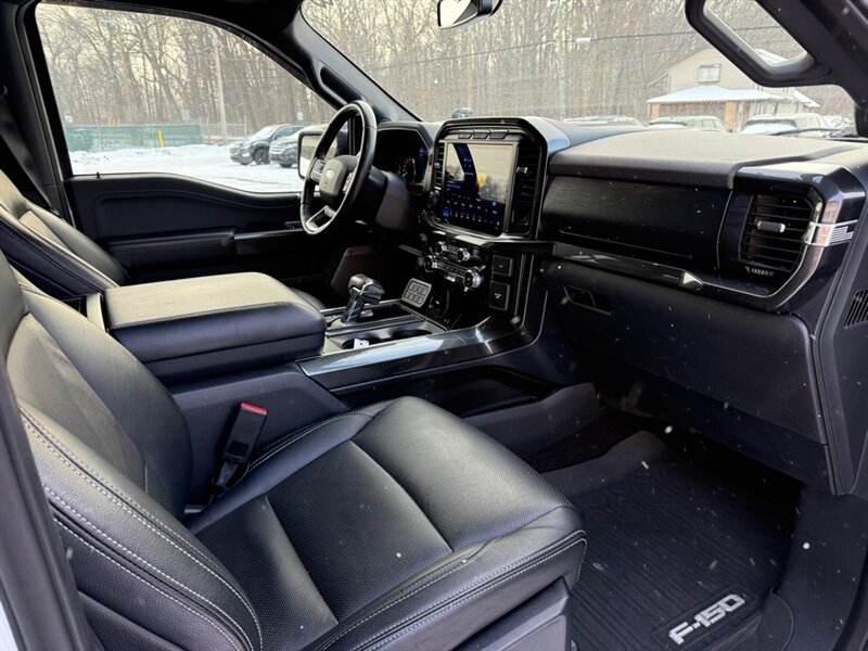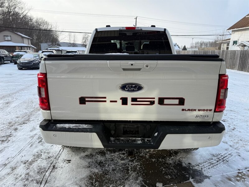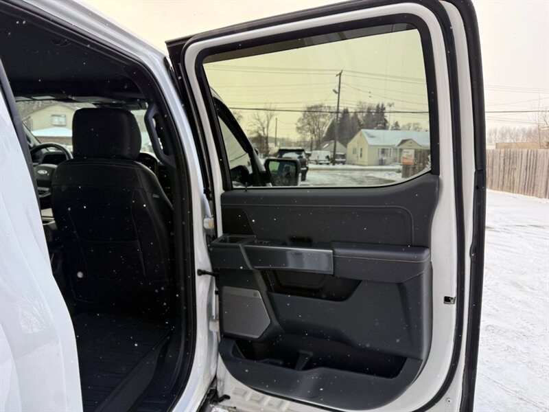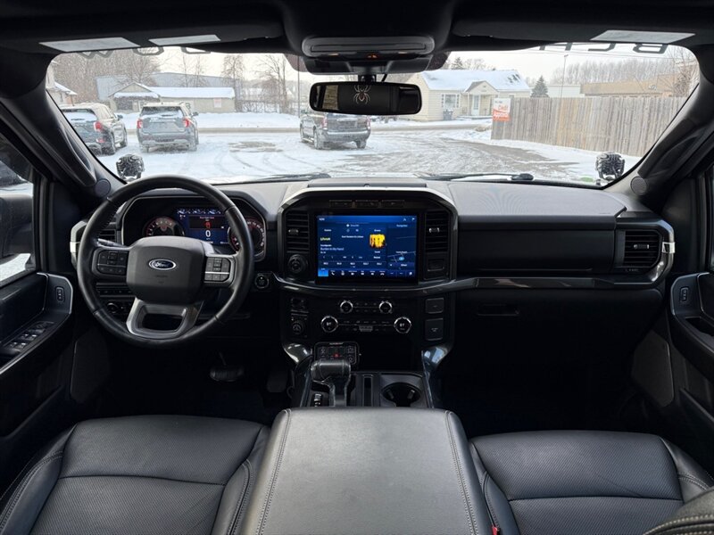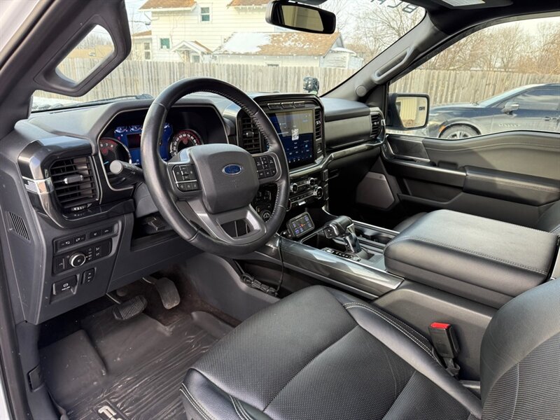 Oxford White 2021 Ford F-150 SuperCrew with sleek Black leather interior, powered by the burly 5.0L Flex-Fuel V8 (400 hp / 410 lb-ft) mated to Ford's smooth 10-speed automatic. Factory equipment covers the essentials and then some: SuperCrew four-door layout, leather-trim seating with power adjustments, touchscreen SYNC infotainment with Apple CarPlay/Android Auto, backup camera, remote keyless entry, cruise control, power windows/locks/mirrors, alloy wheels, and Ford Co-Pilot360 safety tech (Pre-Collision Assist with Automatic Emergency Braking, Lane-Keeping System, Automatic High-Beam headlamps) plus ABS, traction/stability control and multiple airbags. Excellent overall condition, clean CARFAX and one owner - tough enough to haul the toolbox, classy enough to pick up dinner.