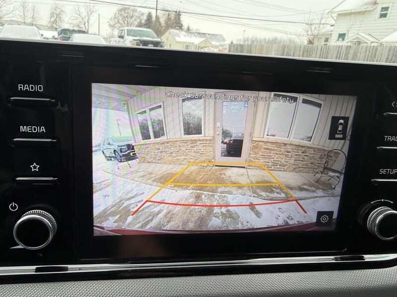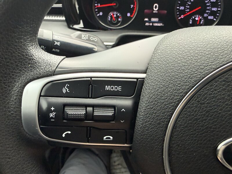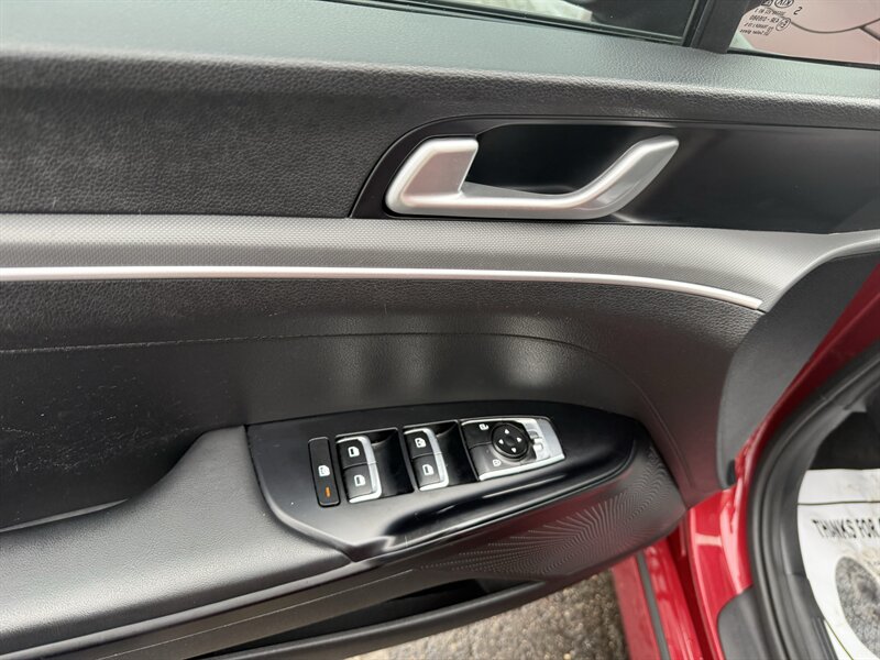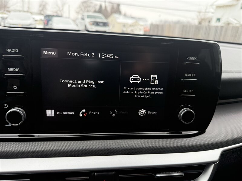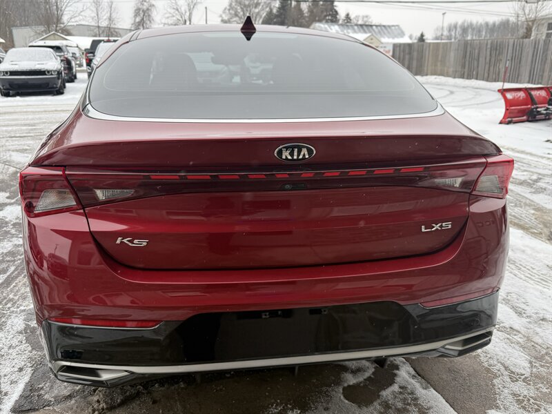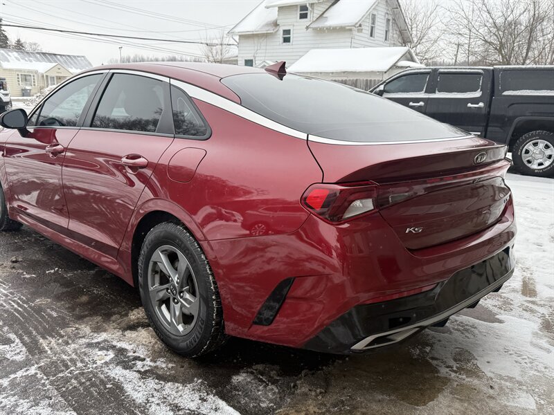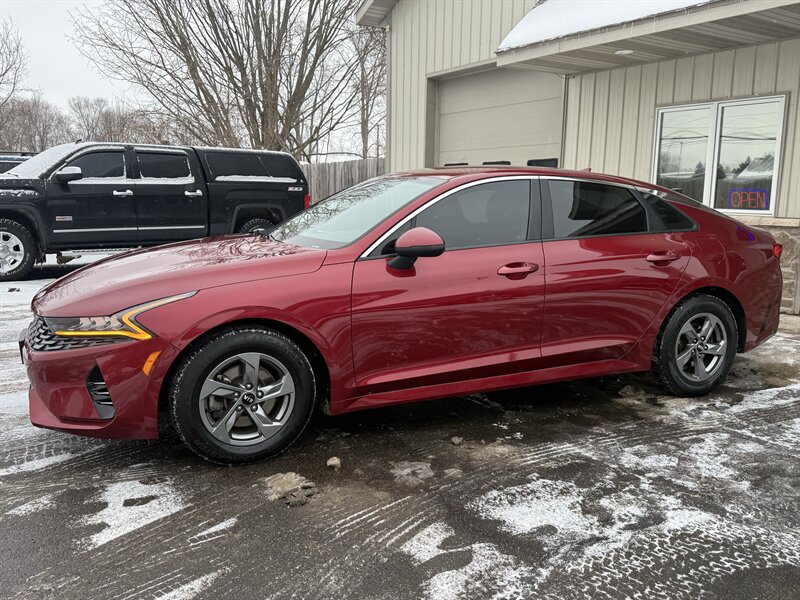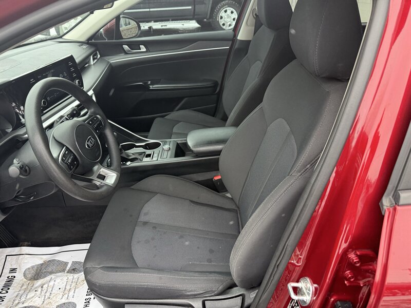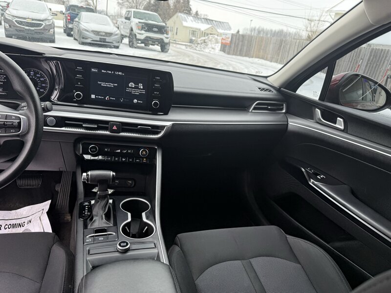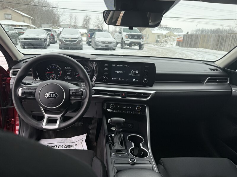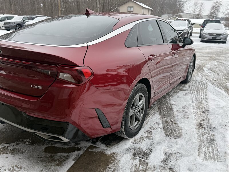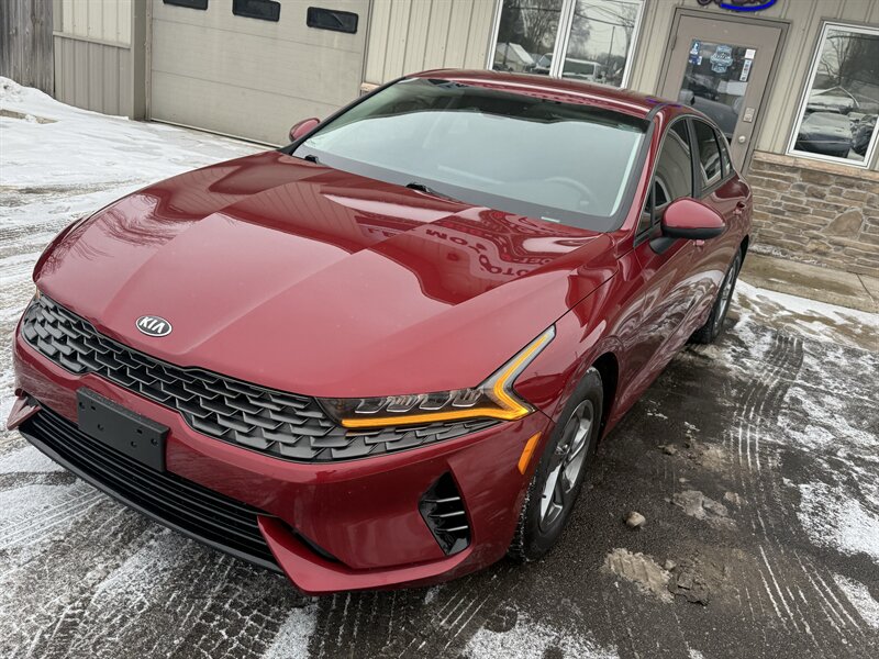 2021 Kia K5 LXS in eye-catching Passion Red Tintcoat with Black cloth - powered by a peppy 1.6L Turbo I4 (180 hp, 195 ft-lbs) and an 8-speed automatic, returning about 27 MPG city / 37 MPG highway. Factory equipment includes an 8'' touchscreen with Apple CarPlay/Android Auto, Bluetooth and USB connectivity, rearview camera, power windows/locks and remote keyless entry, comfortable cloth seating, cruise control, and a modern suite of driver-assist tech (automatic emergency braking, lane-keeping assist, driver attention warning). Excellent overall condition, clean CARFAX, one owner - basically a red sportscoat on a sensible, well-behaved sedan.