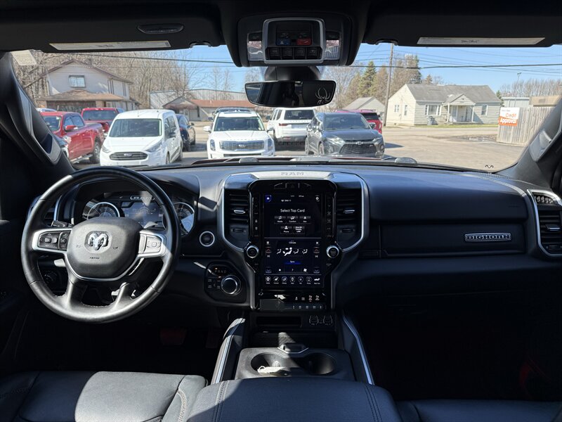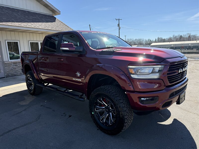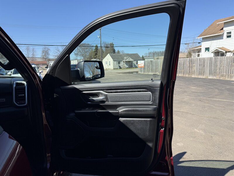 2021 RAM 1500 Big Horn — Delmonico Red Pearl Coat on the outside, Black/Diesel Gray on the inside, and a HEMI 5.7L V8 with 395 hp and 410 lb-ft of torque under the hood. This one returns about 15 MPG city / 21 MPG highway, is in excellent overall condition, has a clean CARFAX and just one owner — basically pre-loved, not pre-wrecked.